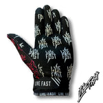 Our Live Fast Motocross gloves are the perfect combination of style and protection. Featuring reinforced stitching, flat velcro, synthetic palms with silicon printing for extra grip, and a super breathable and comfortable design, these gloves are perfect for any rider looking for a stylish and protective glove. The silicon printing provides a secure grip, and the breathable material keeps your hands cool and comfortable. With a bold black and red paisley design, these gloves will turn heads and make you stand out from the crowd. Get ready to hit the Red Line with the boys on a night with Live Fast's Motocross gloves.